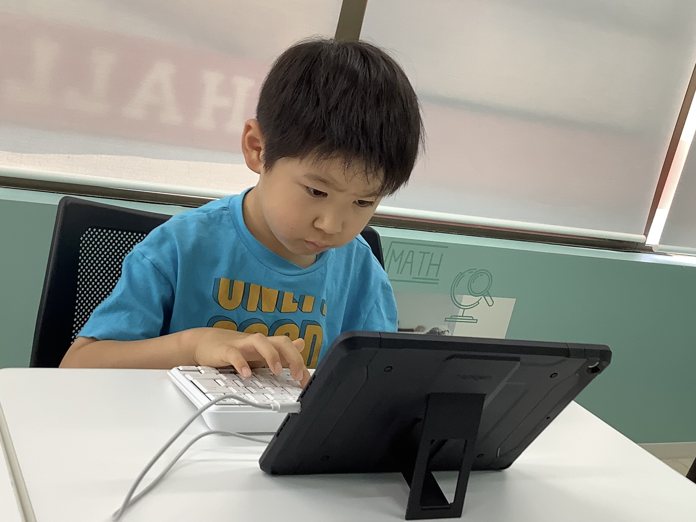 日本語で学んだステージを英語表記のブロックでも取り組むことで、学んだことの定着と英語の勉強にもつながっているようです。習い事の中で一番好きなようです。