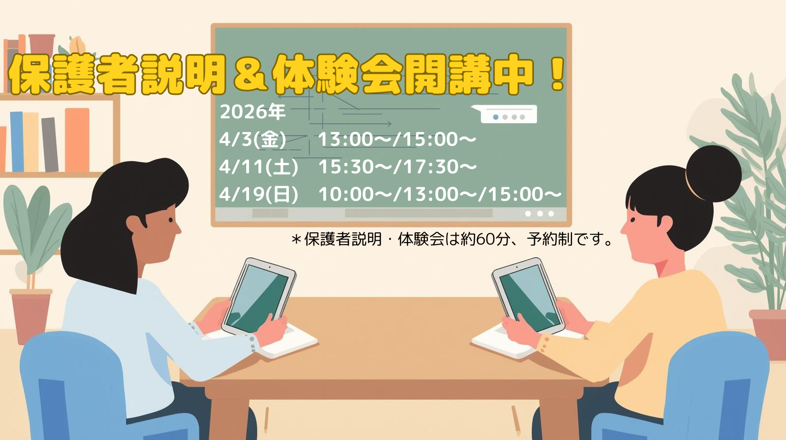 各日程の前日までに、赤い【無料体験申込ボタン】よりお申し込みください。ご要望欄に希望の日時をご記入ください。