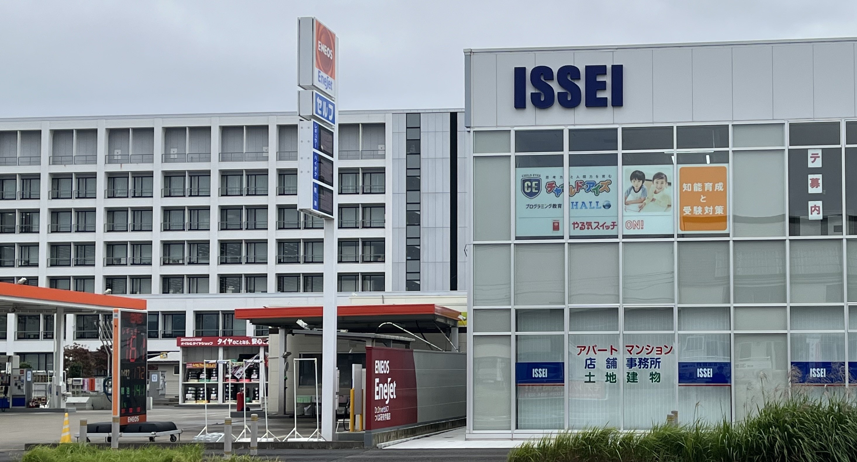 研究学園駅北口を背に大きな交差点に来ると、そこを渡ることなく左折。しばらく歩くと、ENEOSのガソリンスタンド横に見えてくるのがHALLO研究学園校になります。