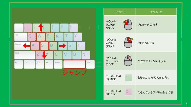 マインクラフトでは、キーボードとマウスを使ってキャラクターを操作します。